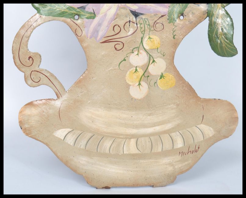 A 19th century Victorian toleware painting of a vase of flowers signed by artist in red Michelet. Measures 49 cm high.