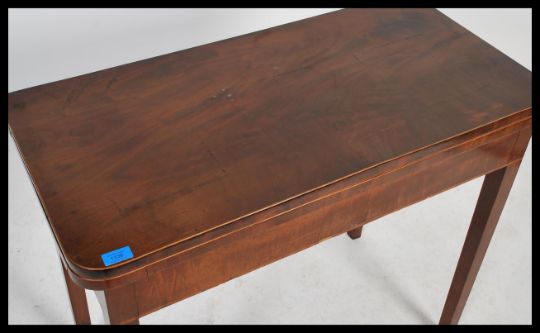 A 19th century Georgian mahogany and line border inlaid games - card table. Raised on square tapering legs with bow corner fitted frieze frame having hinged baize lined table top above. Measures 75cm x 59cm x 51cm.