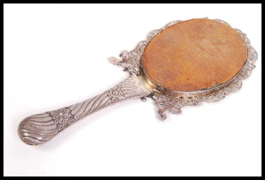 A 19th century Victorian silver hallmarked folding table / hand mirror having a scrolled and pierced border and design . Makers Rosenthal, Jacob & Co (Julius (Judah) Rosenthal & Samuel Jacob). Hallmarked for London 1888.