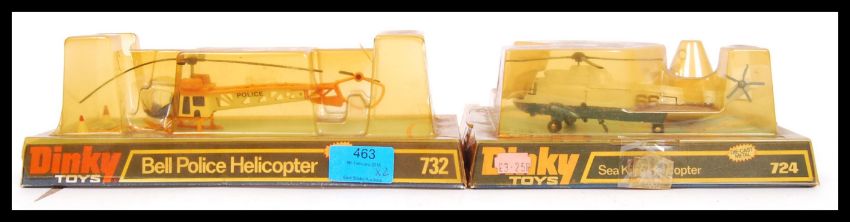 Two vintage Dinky Toys diecast model helicopters to include; 724 Sea King Helicopter & 732 Bell Police Helicopter. Both within their original plastic cases.