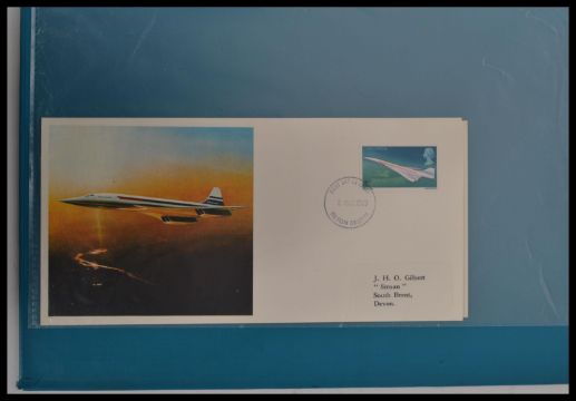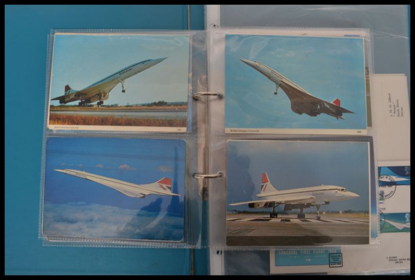 Concorde. Album of postcards (55) depicting the iconic aircraft plus GB 1969 stamp issue on 1st day "Maximum" cards (3) and a First Day Cover all with Filton postmarks.