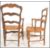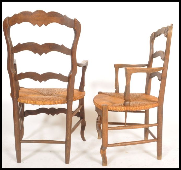 A pair of French country oak provincial windsor carver armchairs having rattan weave seats raised on block and turned legs with stretchers and wavey shaped carved ladder back rests and shaped elbow supports. Measures: 98cm high x 58cm wide x 53cm deep.