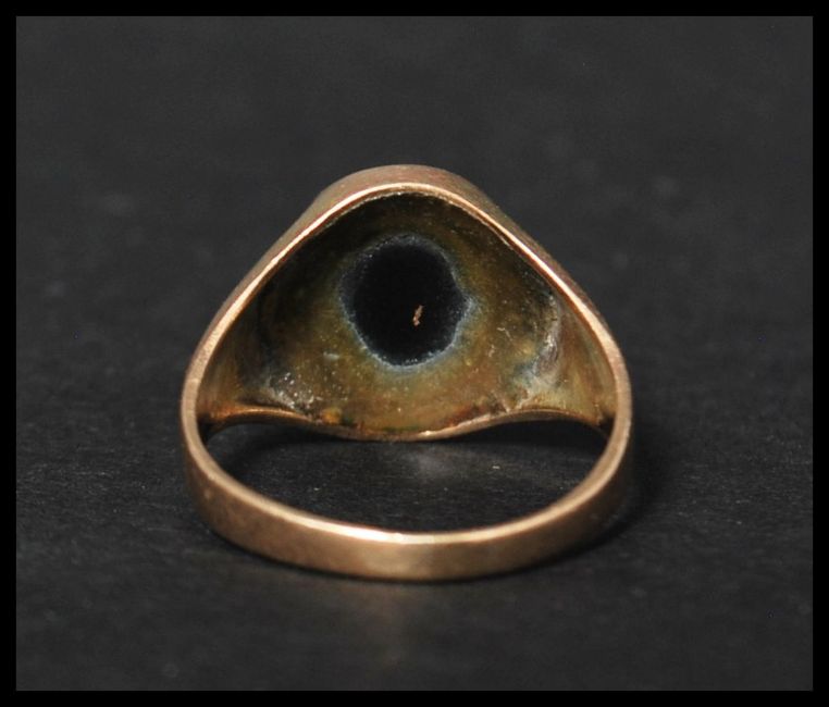 A hallmarked 9ct gold and onyx signet ring set with an oval cut onyx. Hallmarked London. Weight 2.6g. Size M.
