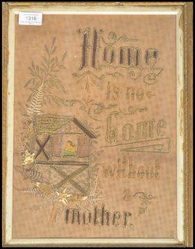 A pair of 19th century framed and glazed needlepoint samplers depicting a house with child in window reading Home is no home without Father / Mother set in ornate gilt relief frames. Measures: 38cm high x 27cm deep.