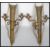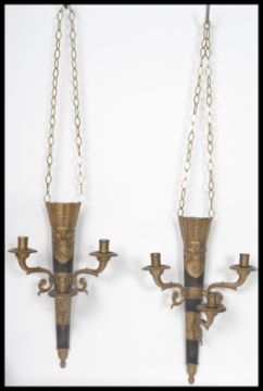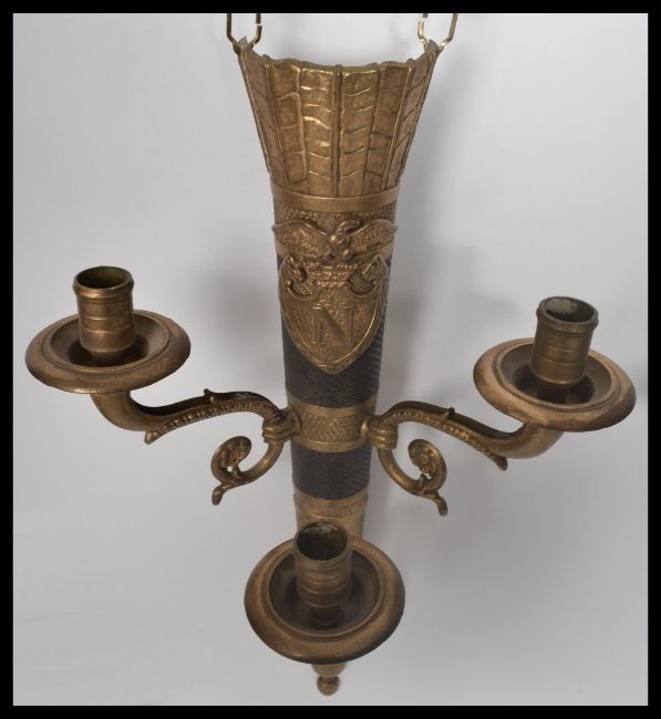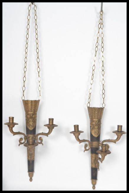 A pair of 20th century gilt and ebonised brass wall sconces of scrolled form having armorial eagle plaques to front. Measures 42 cm high.