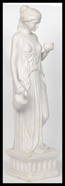 A 20th century floor standing marble statue of neo classical form depicting a maiden holding a pot raised on a pedestal base. Measures 82 cm high.