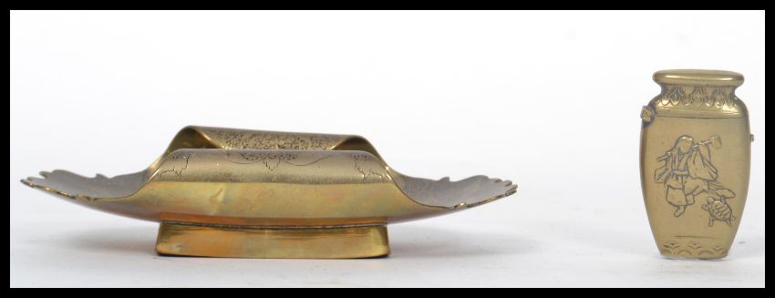 A stunning vintage 20th century brass double scroll end pin dish together with a Japanese brass match vesta. Measures 14.5 cm wide.