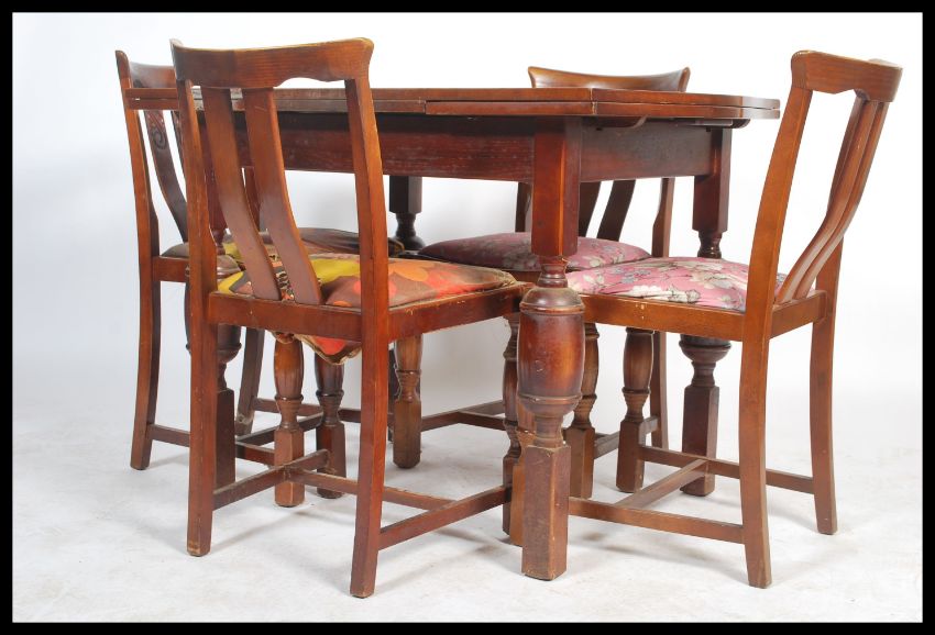 A 1930's Art Deco oak draw leaf refectory dining table and 4 chairs. The table with block and turned legs having extending top together with 4 chairs
