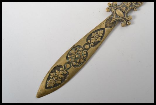 A 19th century French bronze brass paper knife letter opener having a pierced and scrolled decoration with mask details. Measures 25.5 cm long.