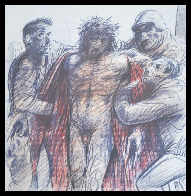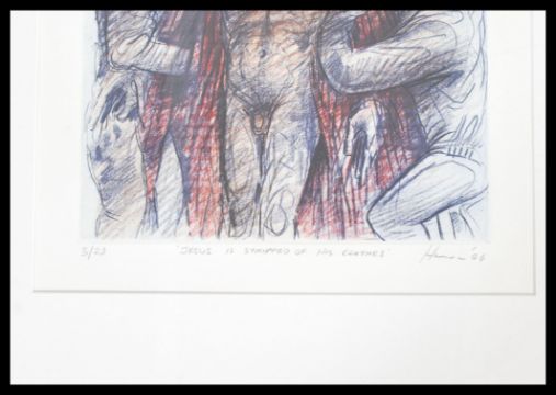 PETER HOWSON OBE, ' Jesus Is Stripped Of His Clothes ' limited edition lithograph, signed in pencil and numbered 3/25, framed and glazed. Measures 25cm x 25cm.