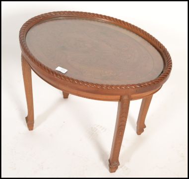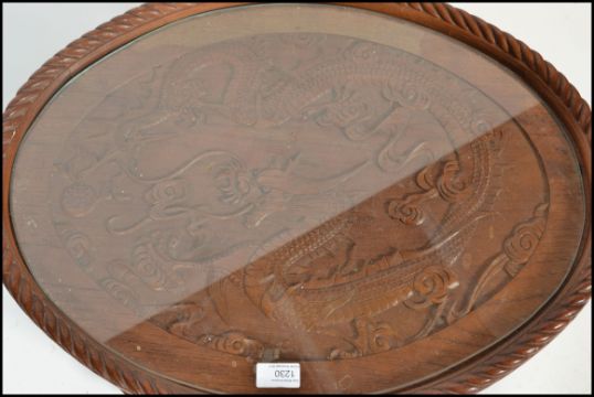 An unusual early 20th century Chinese carved side table. Raised on shaped legs with oval table top having detailed carved panel in relief of a dragon within clouds having glass top above. The oval top with gadrooned borders to the edges. Measures 47cm x 61cm x 47cm.
