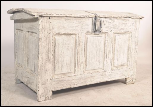 An 18th century large country oak coffere chest of very rustic form having a dome top over thick panelled oak construction, painted white with large cast iron clasp. Raised on stile legs with fielded panel details