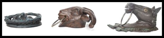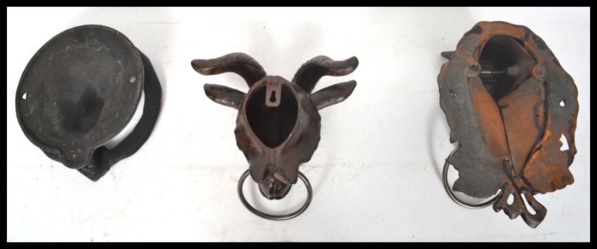 A group of three cast iron door knockers one in the form of a lion one being a ram and one being a horses head. Lion measures 22 cm diameter, Horse measures 29 cm high and Ram measures 25 cm wiide.