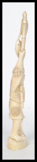 A late 19th century Oriental Japanese ivory carving carved figurine Okimono of a fisherman holding a large bamboo staff with carp fish atop. Measures 23 cm high.