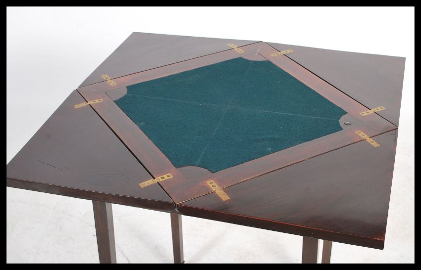 An Edwardian mahogany envelope card - games table being raised on square tapering legs with brown ceramic castors. Above a fitted frieze with envelope fold over baize lined gaming top. Measures: 74cm high x 51cm wide x 51cm deep.
