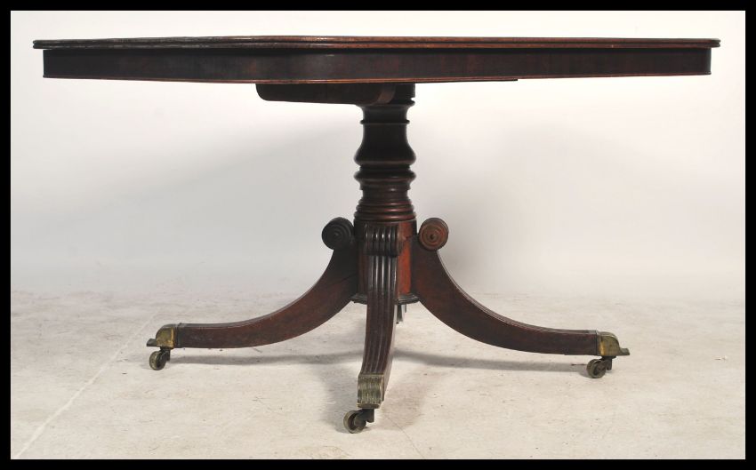 A 19th century Regency breakfast table, circa 1835, the rectangular crossbanded top with rounded corners, raised above a turned stem and four reeded downswept legs, brass caps and castors. Measures 73 cms high x 130 cms wide x 94 cms deep.