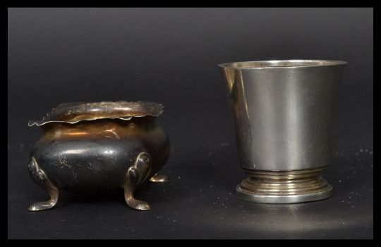 A 1940 Adie Bros of Birmingham silver hallmarked hunting beaker together with a VIctorian silver hallmarked table salt raised on pad feet having scalloped edge bowl. Hallmarked for 1850, Birmingham. Total weight 71.7g
