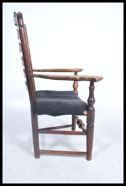 A 19th Georgian elm wood North Country carved armchair. The wavey ladder back armchair raised on bobbin turned legs united by stretchers with unusual carved armrests flanking a rattan seat being later upholstered. Measures 106cm x 70cm x 60cm.