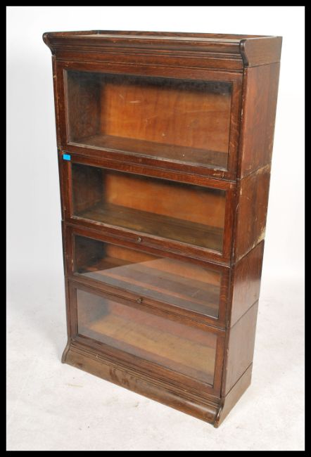 An early 20th century stacking Lawyers oak bookcase cabinet having four glass fronted stacking sections raised on a plinth base with cornice atop. Back of each section stamped Gunn Furniture.