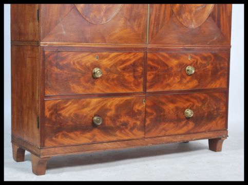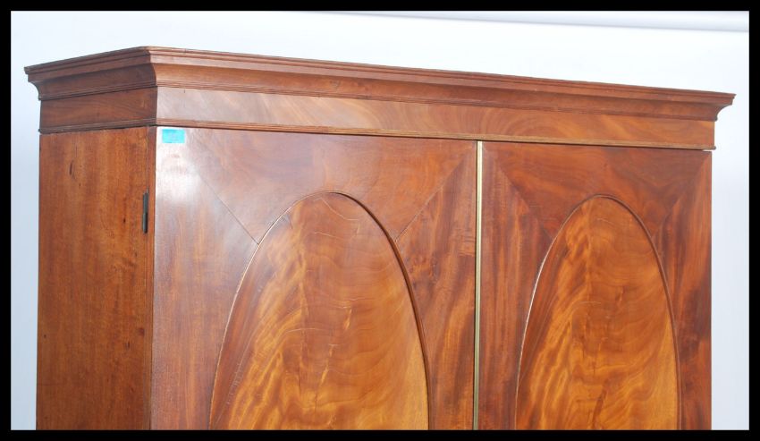 A late Victorian flame mahogany double wardrobe being raised on turned legs with oval panel doors over faux drawer front facia's to the base of doors. Finished with a flared cornice atop.