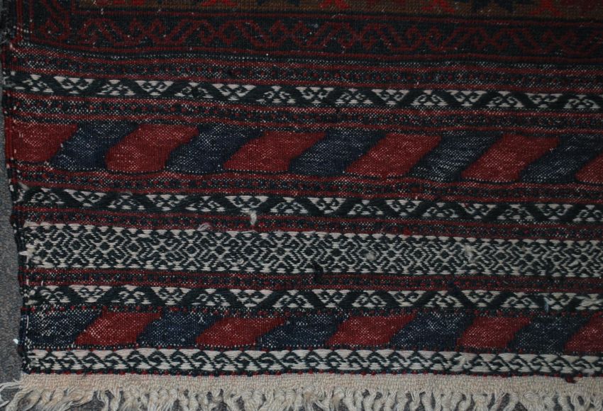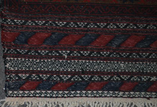 A Persian Islamic floor rug having a deep red and blue ground with central medallion having three layers of varied borders with further geometric border work to ends.