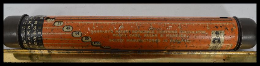 A vintage tin plate advertising pencil case calculator along with a Franklyn's fine shagg novel patience game in tin. Please see images. Case measures 26 cm wide.