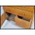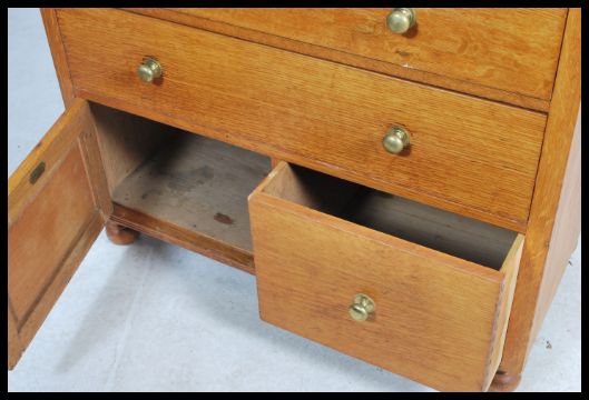 A 1930's Waring & Gillows solid oak dressing table / chest of drawers having an arrangement of drawers and cupboards with mirror atop, raised on bun feet. Retailers label to inside for Waring and Gillows.
