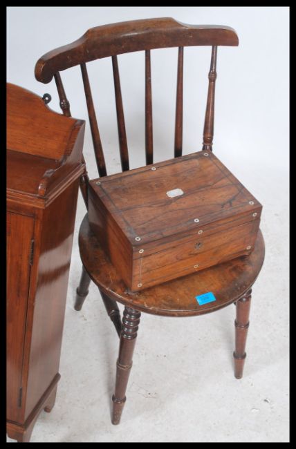 A collection of furniture to include an oak Bureau, mahogany wall hanging cupboard, writing slope and chair.