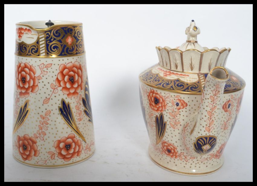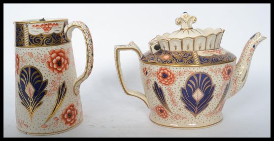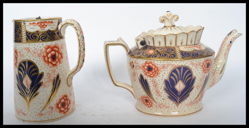 A 19th century Staffordshire teapot in the Imari pattern having a hinged ceramic lid atop together with the matching water jug with fitted pewter lid. Highest measures 78 cm.