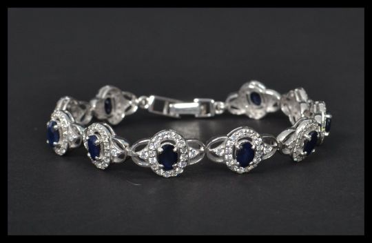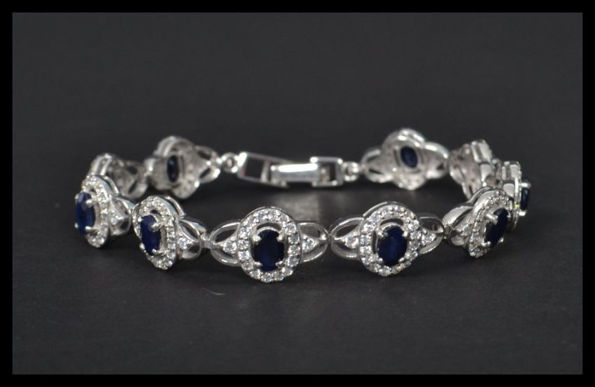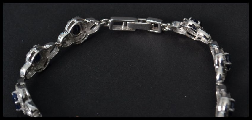A silver CZ and sapphire panel bracelet having a fold over clasp. Weighs 13.9 grams size 8 inches.