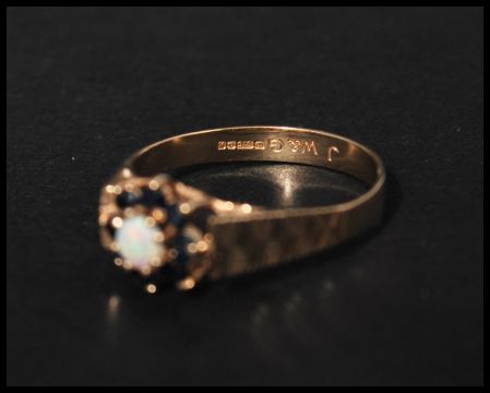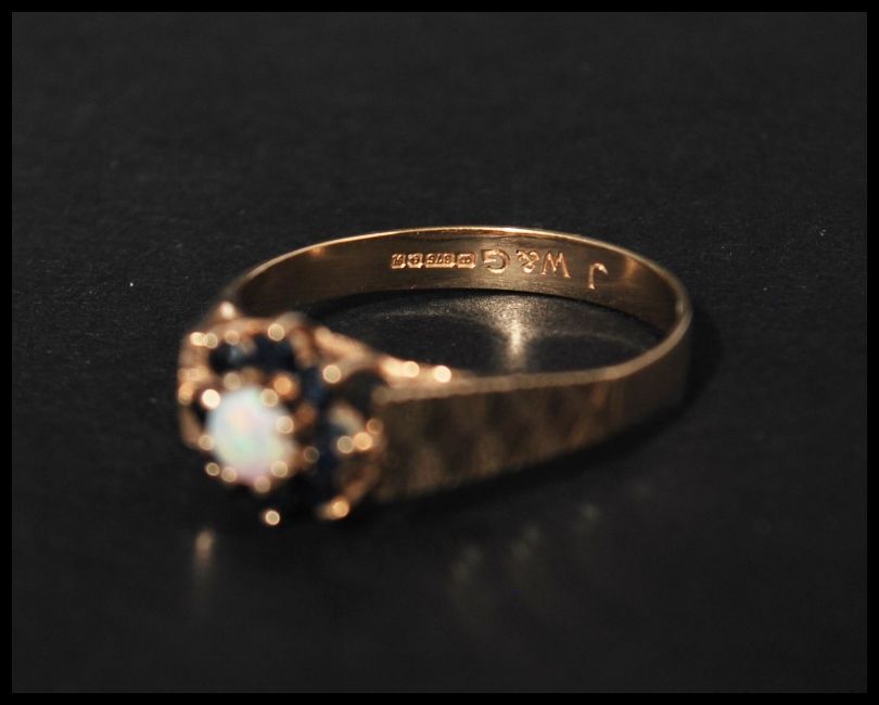 a hallmarked 9ct gold blue sapphire and opal ring set with a central opal surrounded by a sapphire halo having star cut shoulders. Hallmarked Birmingham. Size O.