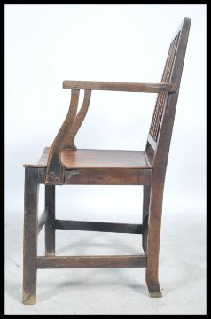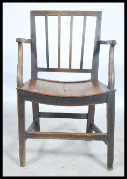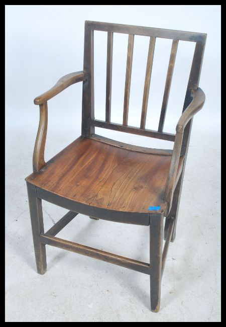A 19th century Georgian beech and elm elbow / hall chair raised on turned supports and rails with elm seat