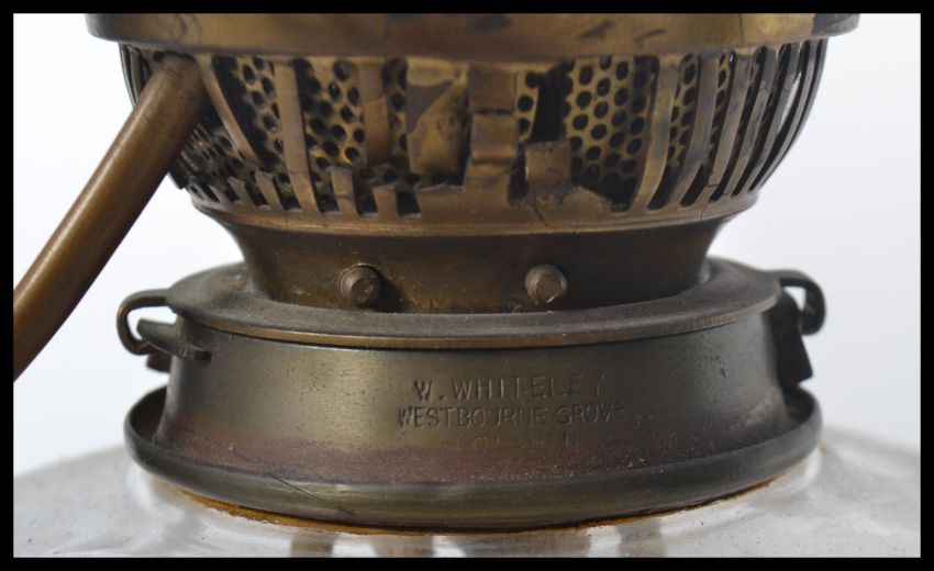 A neoclassical oil lamp being converted to electric the reservoir having a red ground and Greek key pattern to base, notation for William Whitney. Measures 50 cm high.