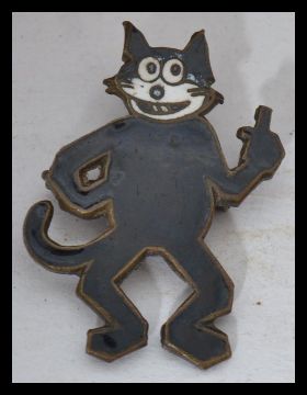 A group of vintage items to include a vintage Pfaff decorated box, a lexicon game, Horlick's pocket mirror, a 19th century Victorian model of a cat in a basket and a Felix the cat badge. Plane measures 24 cm long.