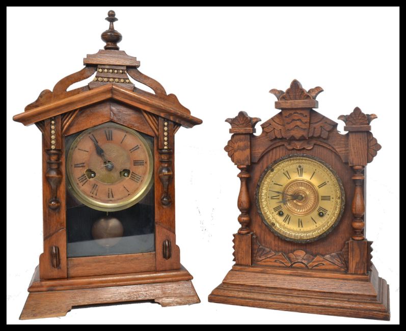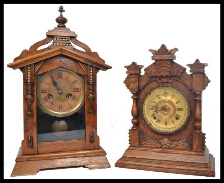 Two vintage early 20th century mantel clocks, both set with eight day movements and retaining original keys, one stamped to the rear for Ansonia. Highest measures 49.5 cm.