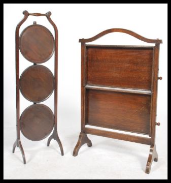 A mid 20th century metamorphic three tier oak cake stand together with another two tier metamorphic cake stand. Measures 81cm x 92cm x 26cm.