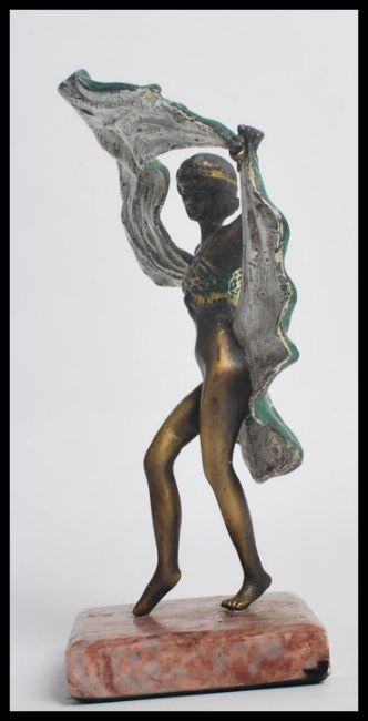 A 20th century cold painted bronze figurine of a dancing Art Deco flapper girl raised on a square marble plinth base, the girls dressing lifting over her head, in the manner of Bergman / Namgreb.  Measures 16cms high.