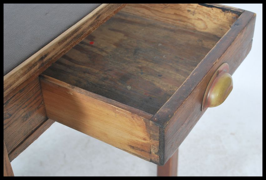 A vintage 20th century teachers school desk, single drawer to front with brass cup handle, raised on square legs together with an elm saddle chair.