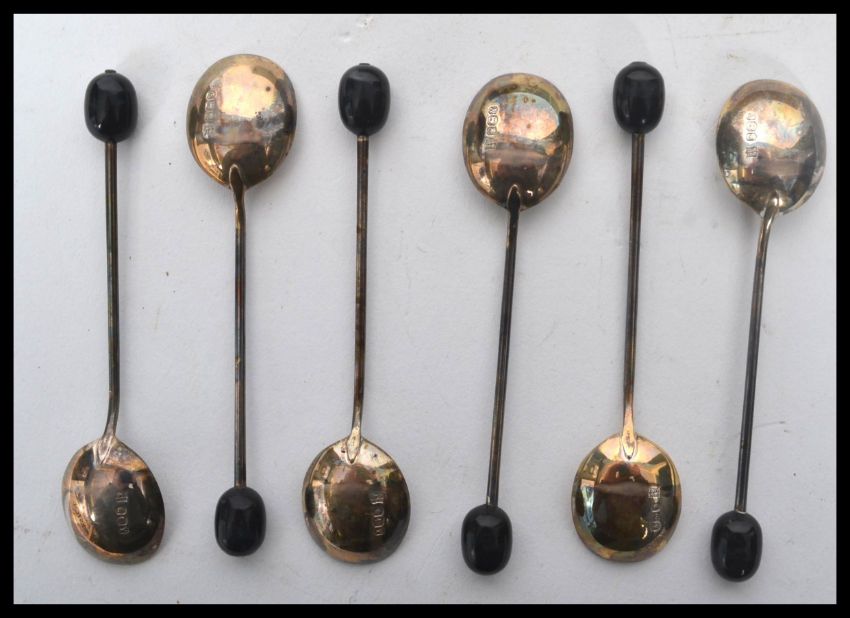 A set of six cased silver hallmarked coffee bean coffee spoons, Sheffield assay marks, possibly by George Bishop & Sons. Measures 9.5 cm long