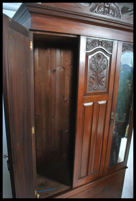 An Edwardian mahogany Art Nouveau wardrobe and dressing table bedroom suite. The wardrobe with mirror door and carved panel details over plinth drawer base. The dressing chest with triple swing mirrors above. Measures 213cm x 117cm x 46cm.