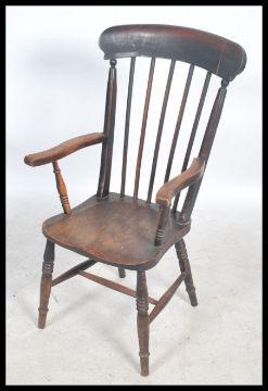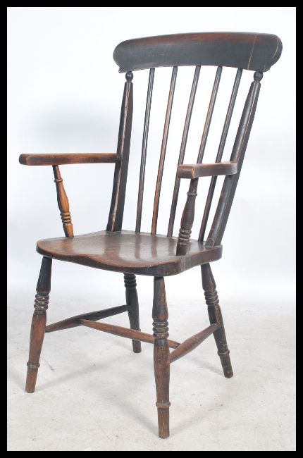 A Victorian beech and elm wood Windsor armchair being raised on turned legs with stretchers having saddle seat and spindle back rest with scrolled elbow supports