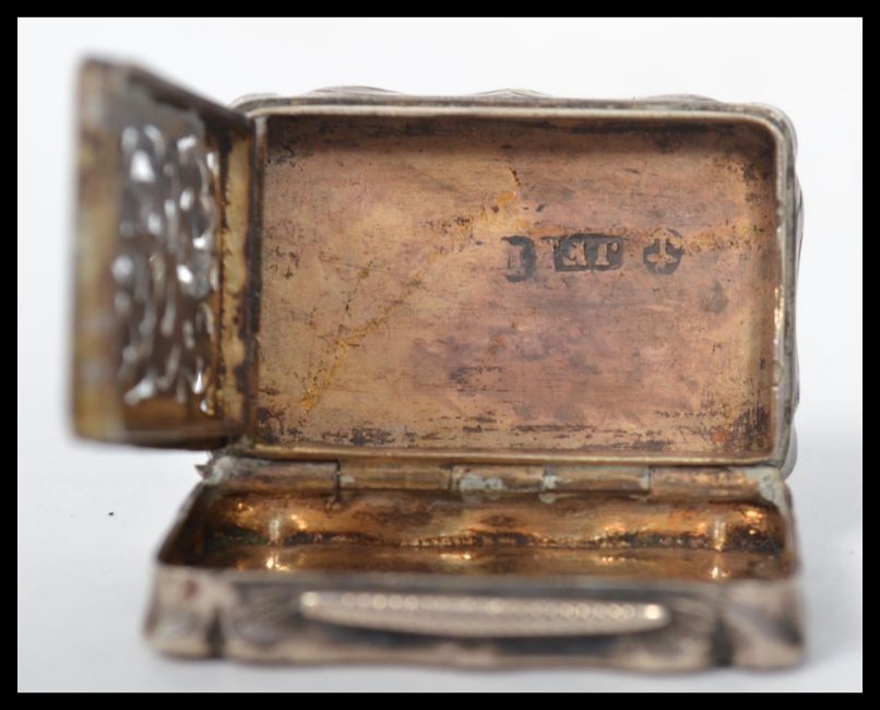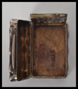 A Victorian hallmarked silver vinaigrette of shaped rectangular form with overall engine turned decoration, with scroll motifs to borders, centered with an oval vacant cartouche to the hinged lid enclosing a gilt interior with pierced scroll grill, James Fenton, Birmingham , with suspension ring. Weighs 15.2 grams. Measures 3.5 cm high, 2 cm wide and 1 cm deep.