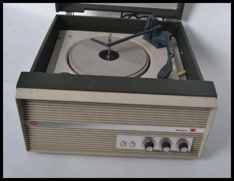 A vintage portable four speed record player by Murphy, dials and speaker to front, BSR deck to the inner. Closed measures 20 cm high, 41 wide and 45 cm deep.