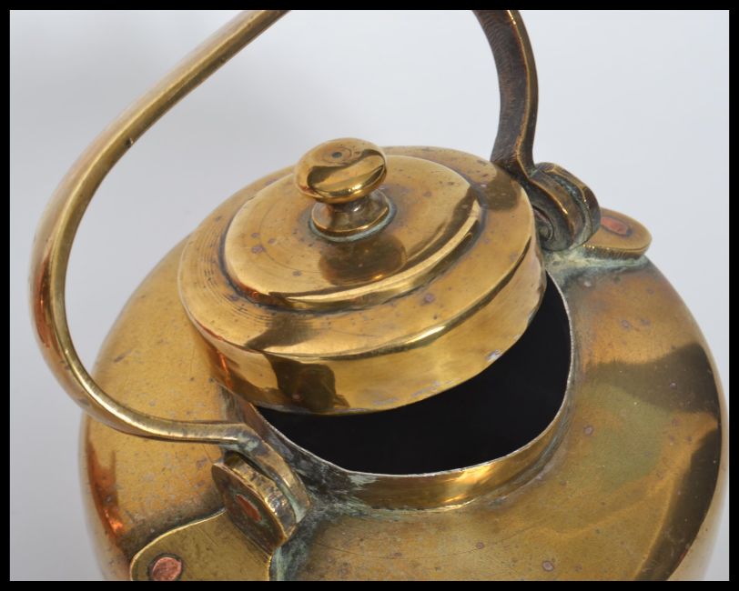 An arts and crafts copper hand beaten jug and bowl along with a brass kettle and two miniature brass vases. Highest 19 cm.