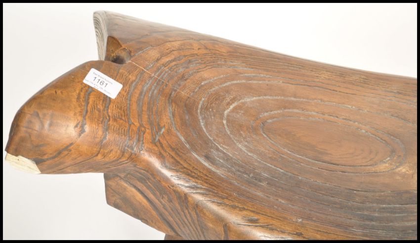 A Chinese elm wood fish stool. Raised on squared legs with upper and lower stretchers having an unusual large rusting polished elm wood seat of shaped fish form