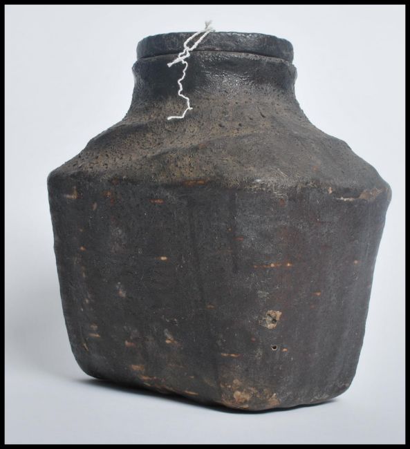 A Chinese 20th century frog basket of banded ebonised wooden construction having a lacquered finish complete with the lid