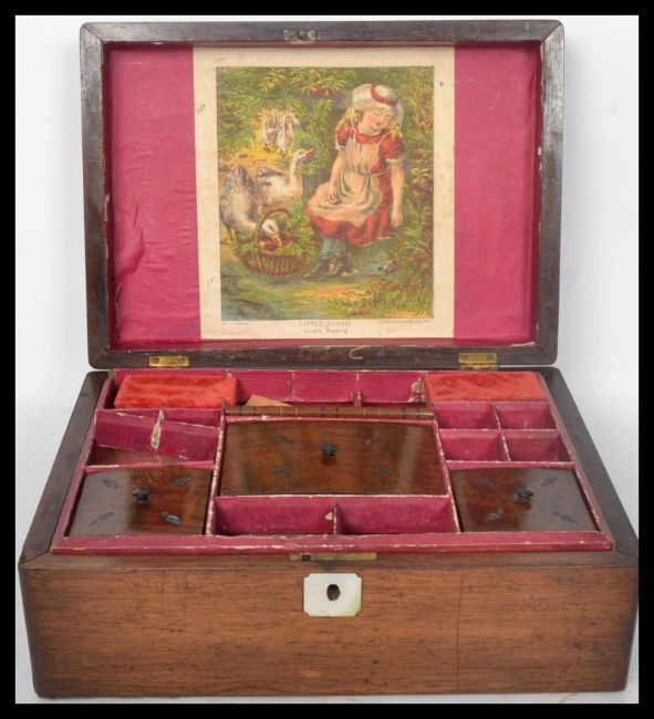 A 19th century ladies work sewing box having an inset mother of pearl cartouche to lid. The hinged lid opening to reveal a fitted and fully appointed interior with pictorial paper label to inside. When closed measures 12 cm high, 30.5 cm wide and 22 cm deep.