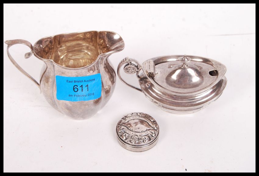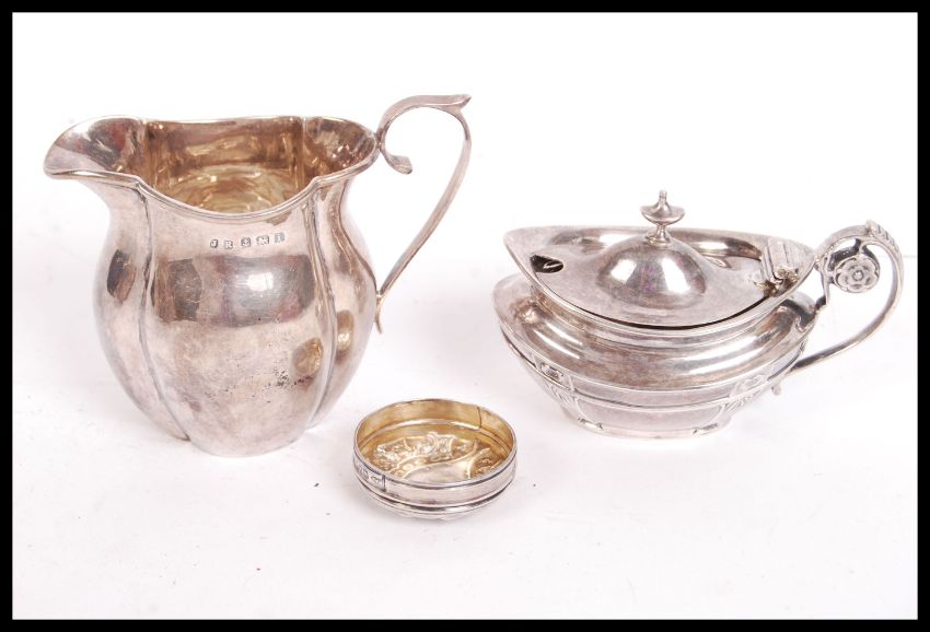 A silver hallmarked creamer Birmingham assay marks, makers marks for John Rose and dating to 1908 together with a stunning silver hallmarked mustard pot, London assay marks, dating to 1901 also with a silver lid. Total weight 144g.