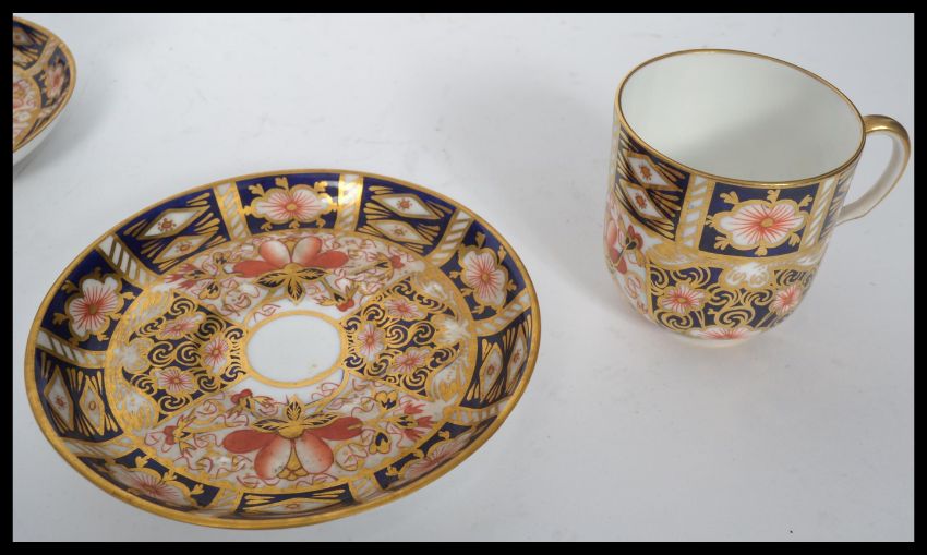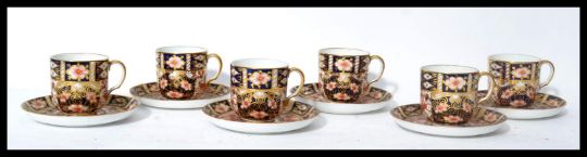 An early 20th century Royal Crown Derby six piece coffee can and saucer service / set dating to 1913 in the Imari pattern. The saucers measuring 11cms diameter