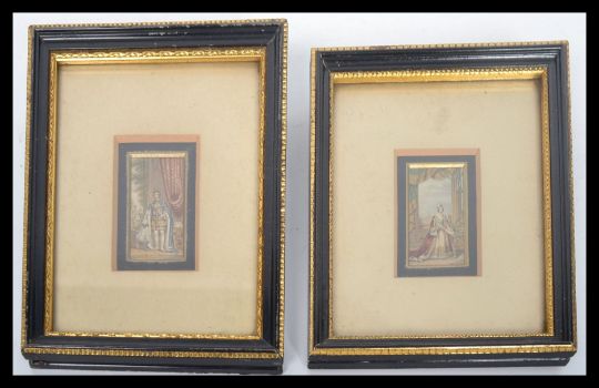A pair of Victoria and Albert hand coloured prints portrait miniatures in the original ebonised and gilt slip frames being later framed and glazed in larger frames. The miniatures measure 6 cm high.
